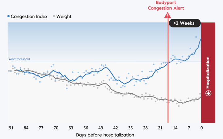 The Bodyport Congestion Index combines multiple hemodynamic biomarkers captured by the Cardiac Scale into a single composite metric to help accurately detect early signs of worsening heart failure. In clinical study, the Congestion Index detected 70% of heart failure events — twice as many as standard weight-based rules — while generating fewer false alerts. This can support earlier identification of worsening status while helping reduce alert fatigue.