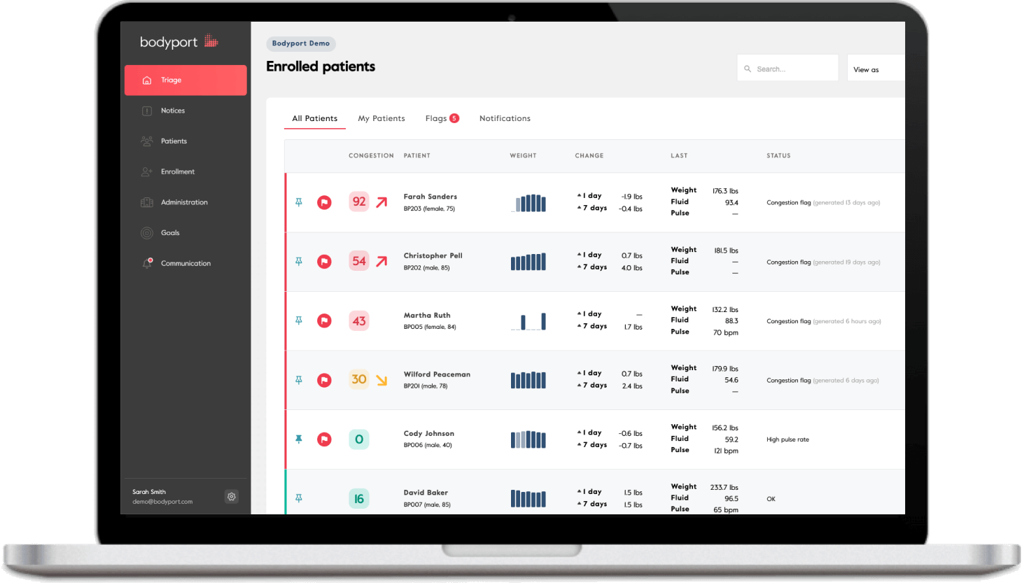 Bodyport’s care platform connects a powerful clinical portal with an intuitive patient app to deliver timely, actionable insights. Clinicians receive clear signals to help guide care, while patients benefit from a simple, supportive at-home experience. A robust API enables seamless integration with leading EHRs and third-party systems, and full support for RPM billing makes reimbursement straightforward. The platform also tracks patient engagement and automatically documents clinical activities for compliance, all within a fully HIPAA-compliant, SOC 2-certified system.